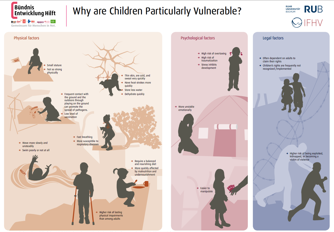 Children are particularly badly affected by natural disasters, and they’re more at risk than the adults because as a rule they’re not as physically strong. They’re often not as well protected legally, either, being less able to demand their rights, although these are protected by the Convention on the Rights of the Child. For children, the initial situation after a disaster is especially difficult.