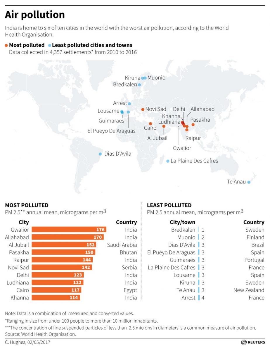 According to data from the World Health Organization, India has 14 out of world’s 20 most air polluted cities in the world. Delhi and Varanasi are among the most polluted regions in terms of PM2.5 levels. The data released is for pollution levels that were studied from 2016.