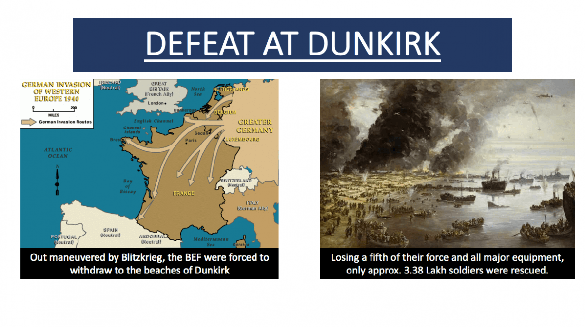 8. German Perspective During the same two decades (1918 to 1939) and between the world wars, Germany developed the tactics of ‘Blitzkrieg’ or Lightning War. Multi-arm combat formations, comprising tanks, infantry in armored carriers, motorized artillery, parachute infantry and dive bombers were grouped under independent commanders with different objectives. Operations were developed on narrow frontages and easily broke through the linear defenses of the Maginot Line. In six weeks from 10 May 1940 to 25 June 1940, Germany captured France, Belgium Luxemburg and the Netherlands. The British Expeditionary Force after being over-run, were forced to withdraw to the beaches of Dunkirk; from where they were extricated at great cost, losing a fifth of their force and all their heavy equipment.