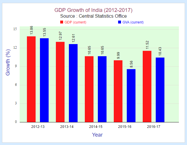 The economic slowdown has been attributed to the effects from demonetization and the roll out of GST. The Goods and Service Tax is a value added tax, which is multi-stage and destination-based taxation on each stage of good and service production as well as generation.