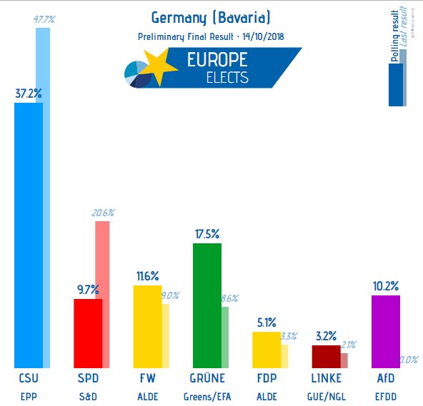 The results showed the CSU falling from nearly half the vote five years ago to 37.2 per cent. The Green Party surged to second place, with 17.5 per cent, and the far-right Alternative for Germany is set to enter the Bavarian parliament for the first time, with 10.2 per cent.