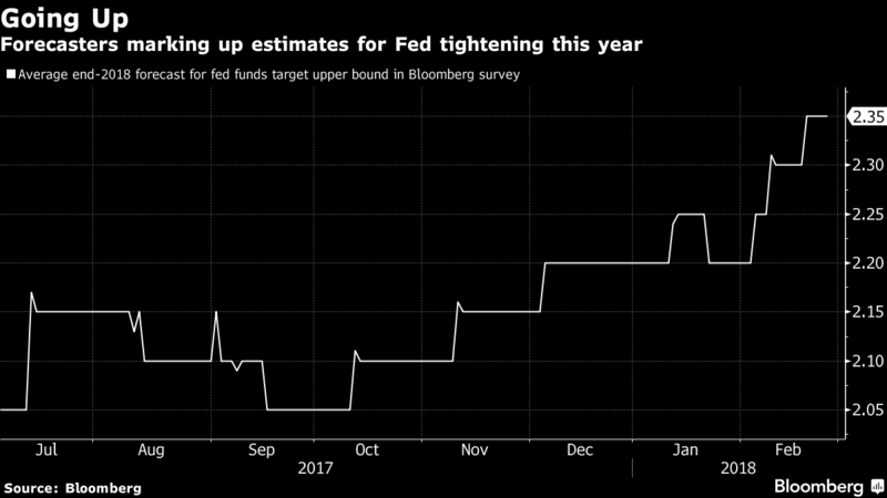 “My personal outlook for the economy has strengthened since December. We’ve seen continuing strength in the labor market,” Powell told the House Financial Services Committee in his first hearing as Fed chief. “We’ve seen some data that will in my case add some confidence to my view that inflation is moving up to target. We’ve also seen continued strength around the globe, and we’ve seen fiscal policy become more stimulative.”