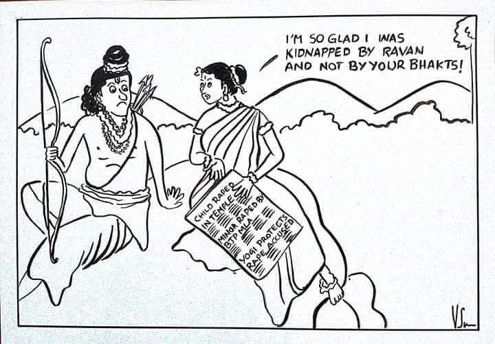 Swathi Vadlamudi is a journalist and a cartoonist, who published a politically and religiously tinged cartoon on Facebook. The cartoon depicts a fictional conversation between two Indian gods, Lord Ram and Sita. In the piece, Sita comments on the Kathua rape case. She “tells” Lord Ram that she is “glad” that she was kidnapped by Ravan (the mythical antagonist of Ramayana) than “bhakts”.