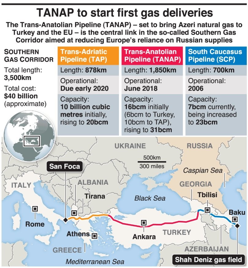 According to Reuters, the increase in global natural gas production, the buildup of new gas transport infrastructure, the decrease in natural gas prices, the growth of liquefied natural gas (LNG) trade are all already increasing the options for Europe’s gas importers and reducing the influence of the Russian energy giant Gazprom. The Southern Gas Corridor is fundamental to European politics and energy in order to avoid an energy crisis like that of 2009 when Russia’s Gazprom cut off supplies via Ukraine.