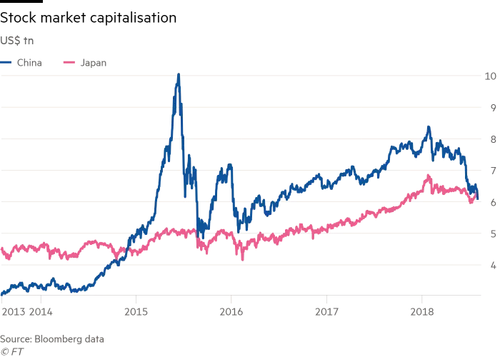 The CSI 300 index of major stocks listed on the Shanghai and Shenzhen exchanges is down by more than 17% year to date, while the onshore renminbi exchange rate has weakened 5.3% against the dollar. By comparison, Tokyo’s Topix index has fallen just 4% in 2018, while Japan’s yen has gained nearly 1% on the greenback. China’s stock market overtook Japan’s stock market in late 2014, then soared to an all-time high of more than $10 trillion in June 2015.