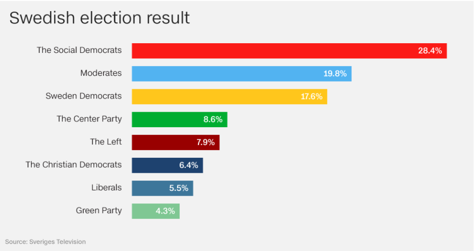 Sweden is the latest European country in which a populist surge fuelled by anti-immigration sentiment is changing the political landscape. With 84.4 percent of votes counted, the Sweden Democrats had 17.6 percent of the vote compared to 28.4 for the Social Democrats, according to the Sweden public broadcaster.