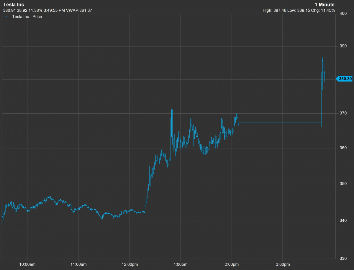 Tesla shares ended the day 11% higher at almost $380 per share – close to their all-time high.